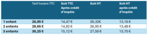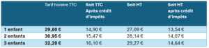 Tarif révisé chaque année au 01/09 et lors de chaque augmentation légale du SMIC horaire